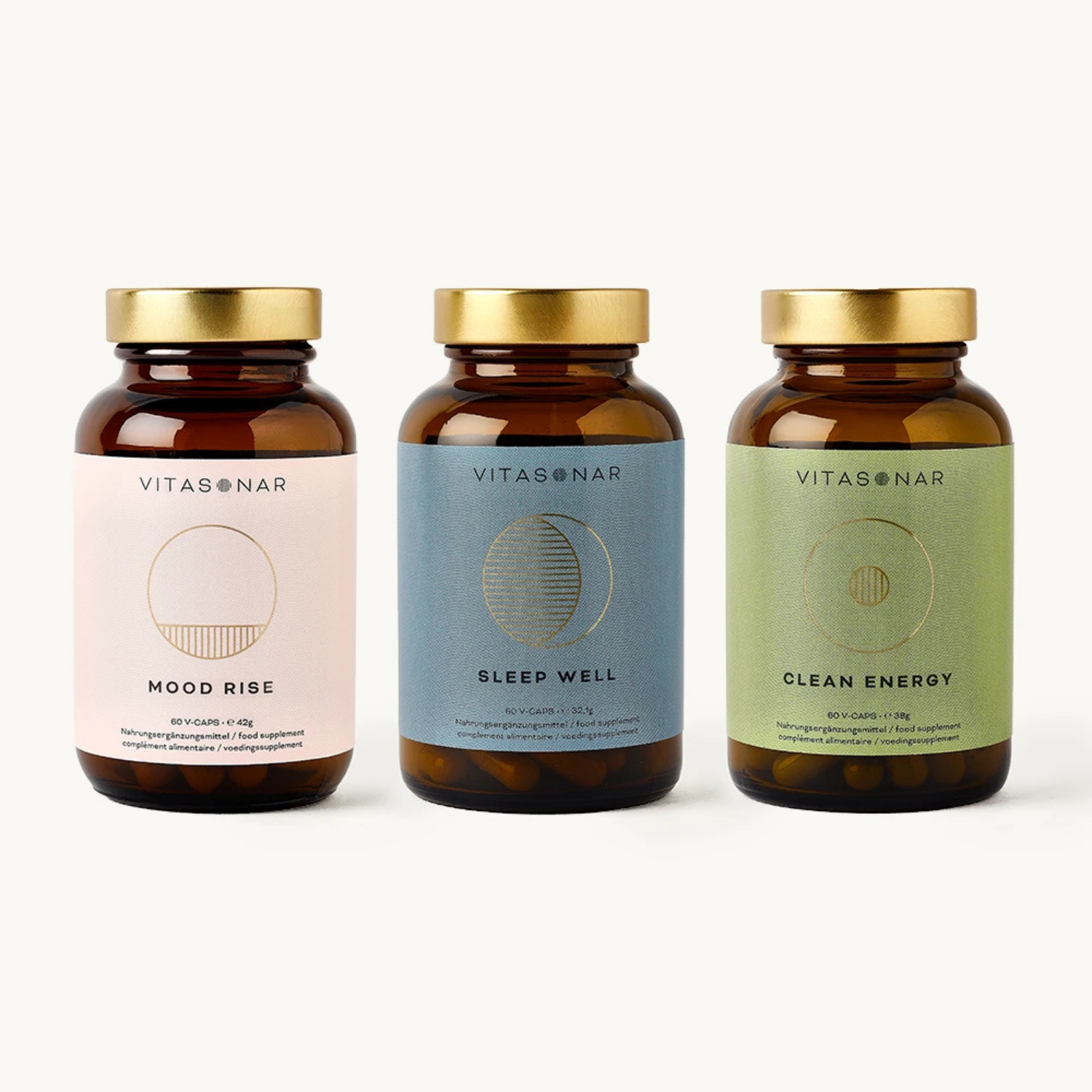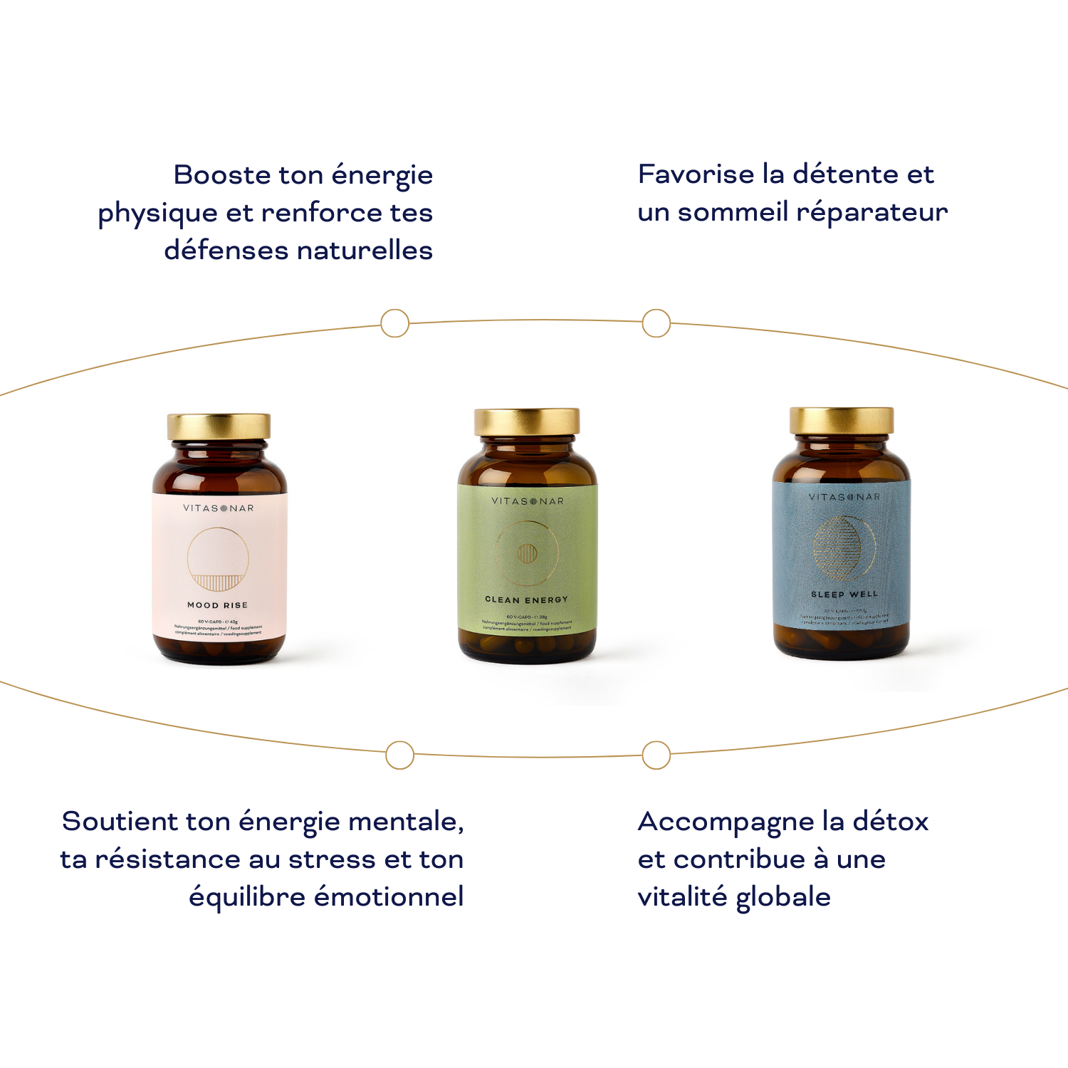 Trois compléments complémentaires assurent un soutien continu du corps et de l’esprit, jour et nuit.
