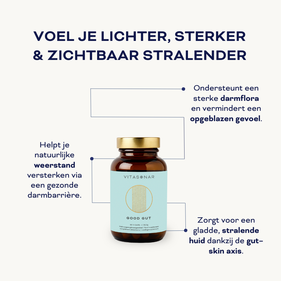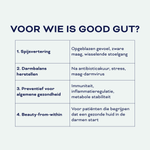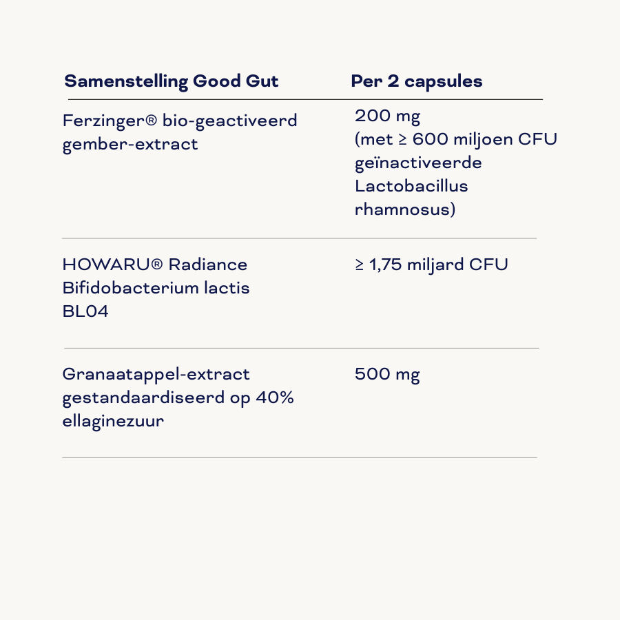 Good Gut is een geavanceerde microbiotica-formule die in de eerste plaats de darmflora, spijsvertering en darmbarrière ondersteunt. De krachtige combinatie van HOWARU® Radiance probiotica, gefermenteerd gemberextract en granaatappelpolyfenolen bevordert een vlotte en comfortabele spijsvertering, vermindert een opgeblazen gevoel en helpt een evenwichtige, gezonde darmflora op te bouwen. Door de darmbarrière te versterken en laaggradige inflammatie te verminderen, draagt Good Gut bij aan een hogere natuurlijke weerstand en een algemeen lichter, energieker gevoel. Als bijkomend voordeel heeft deze verbeterde darmbalans ook een positieve impact op de huid: een stralendere, gladdere en beter gehydrateerde teint — een resultaat van de werking op de gut–skin axis.