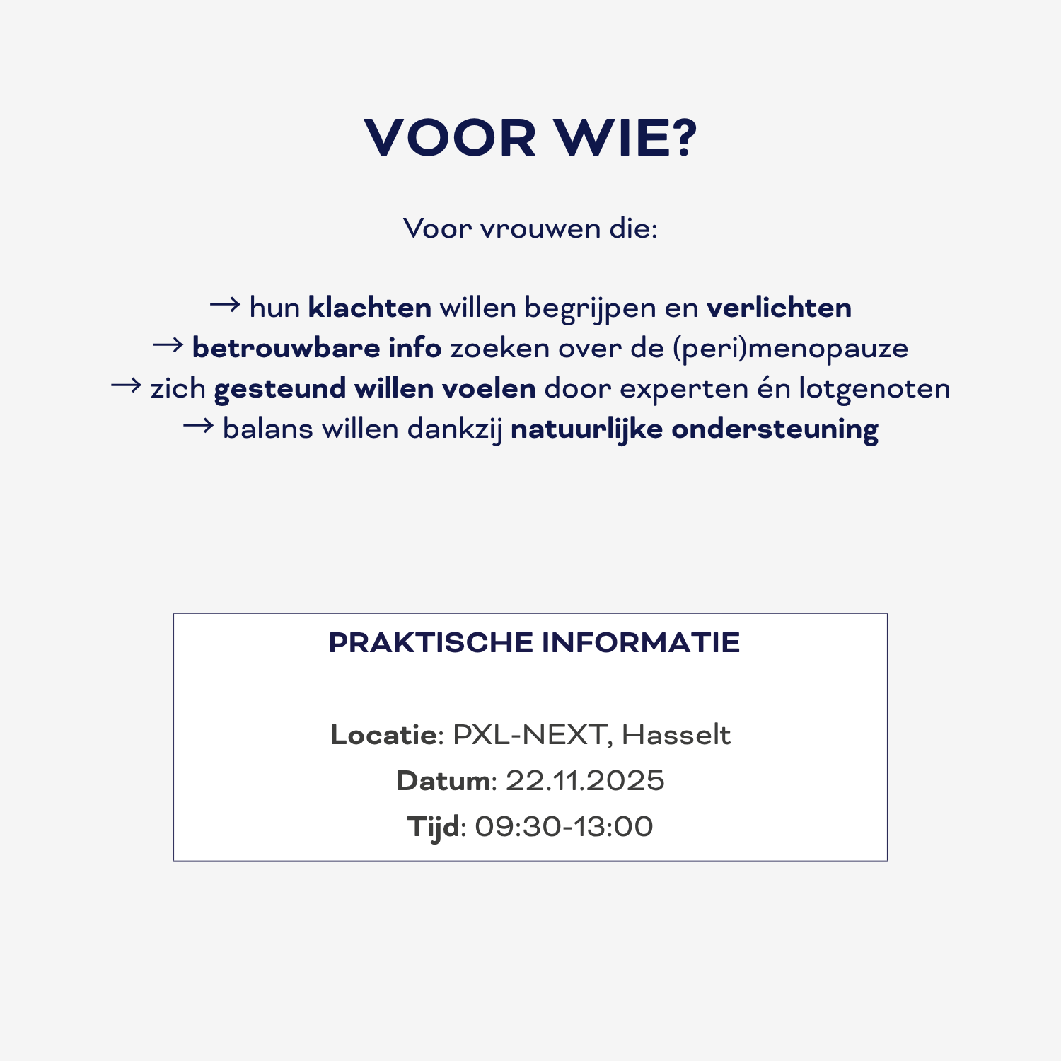 Dit seminarie richt zich tot vrouwen die graag meer inzicht willen krijgen in de (peri)menopauze en de veranderingen die daarbij horen. Het is waardevol voor wie praktische manieren zoekt om klachten te verlichten, wie zijn lichaam op een natuurlijke manier wil ondersteunen en voor wie zich gesteund en begrepen wil voelen in deze belangrijke levensfase.
